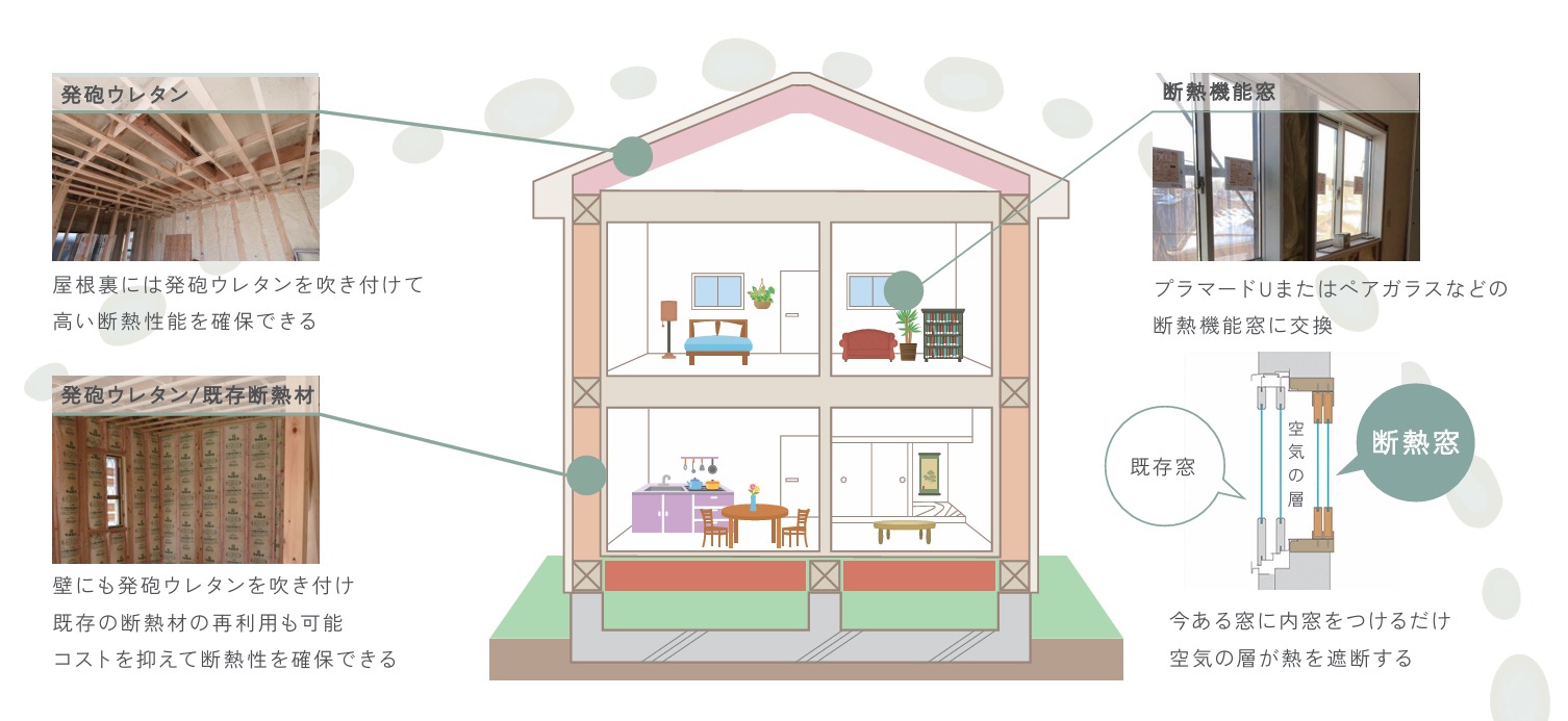 屋根裏と壁に発砲ウレタンを施工し、既存の断熱材も再利用。