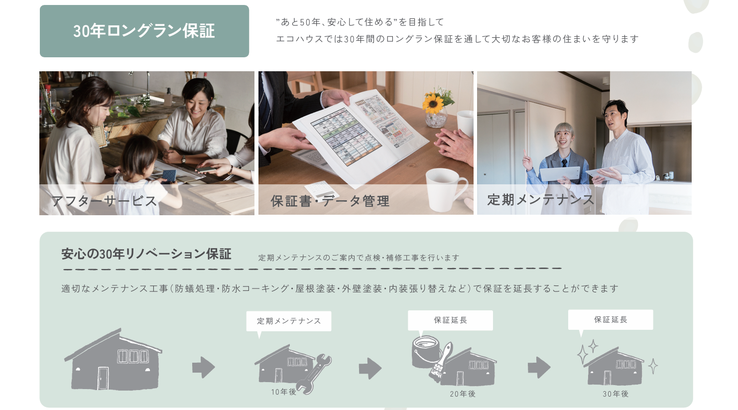 エコハウスは30年保証+定期点検で、お引渡し後もずっとお客様をサポートします。