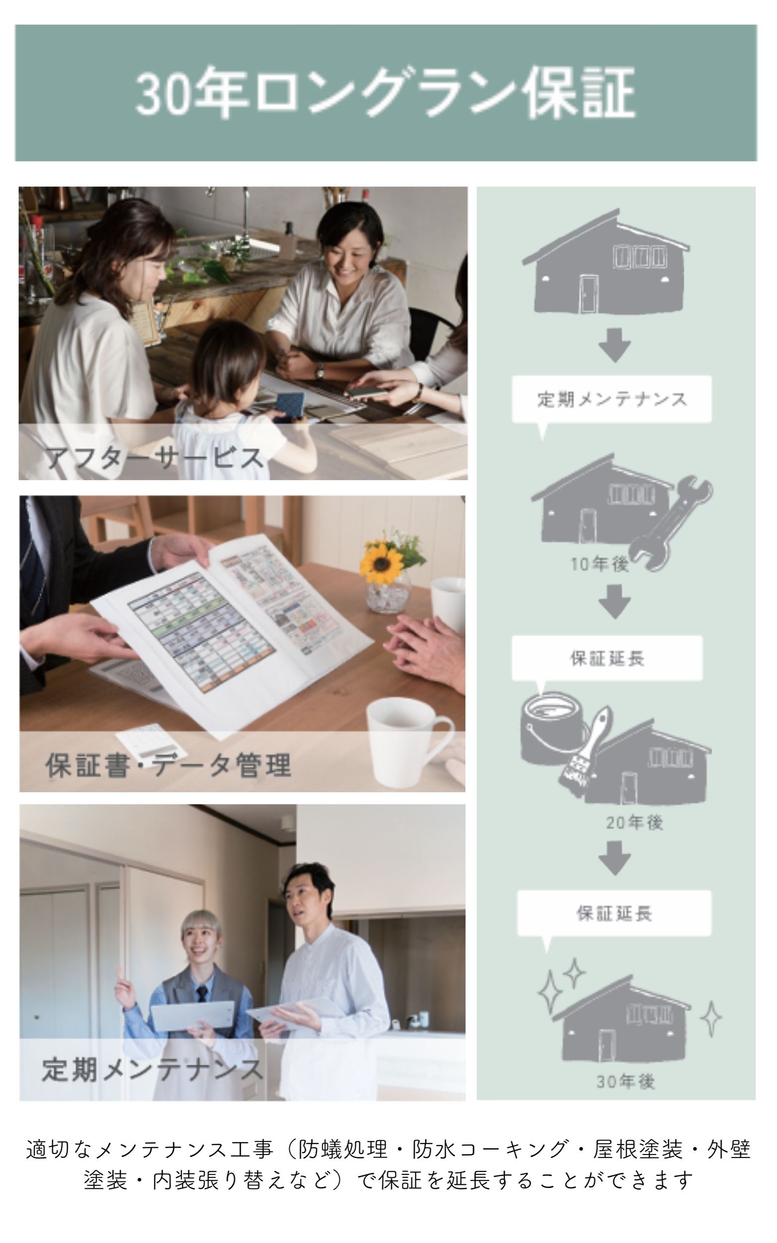 エコハウスは30年保証+定期点検で、お引渡し後もずっとお客様をサポートします。